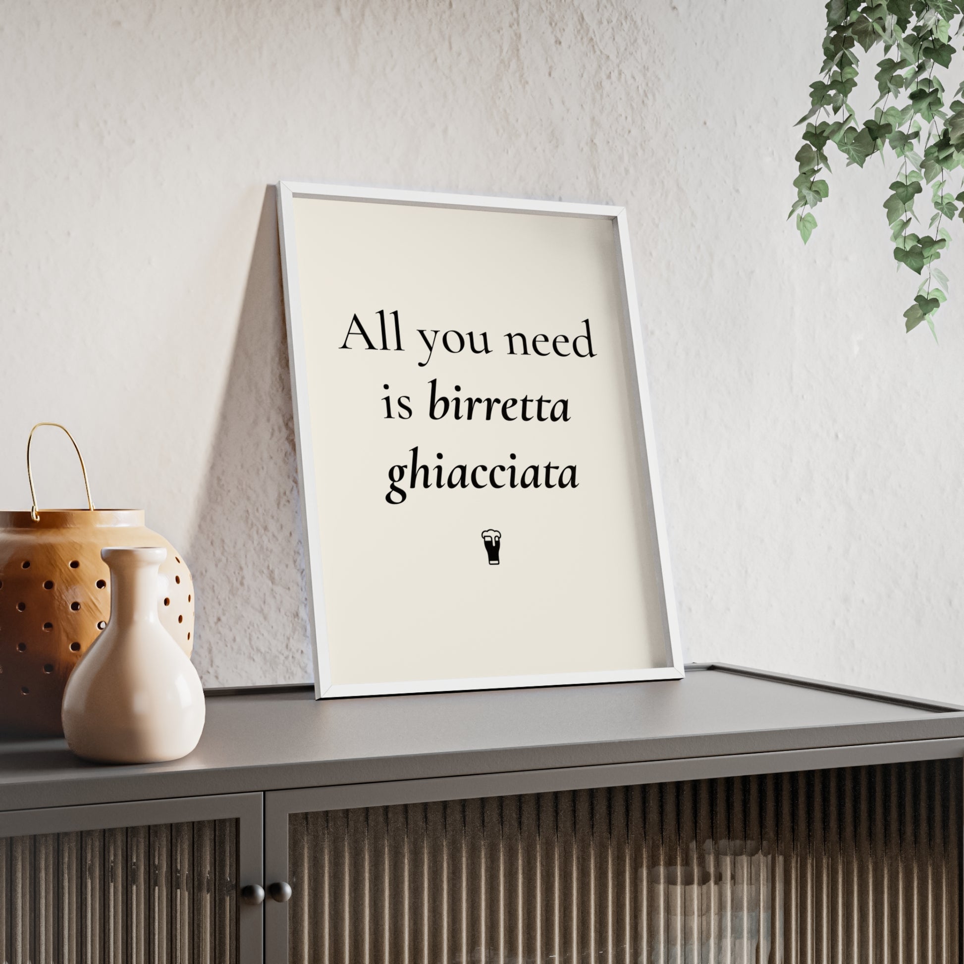 Questo poster celebra le vere priorità con ironia e semplicità: poco romanticismo, molta freschezza. Tipografia elegante, messaggio da bar con vista tramonto.