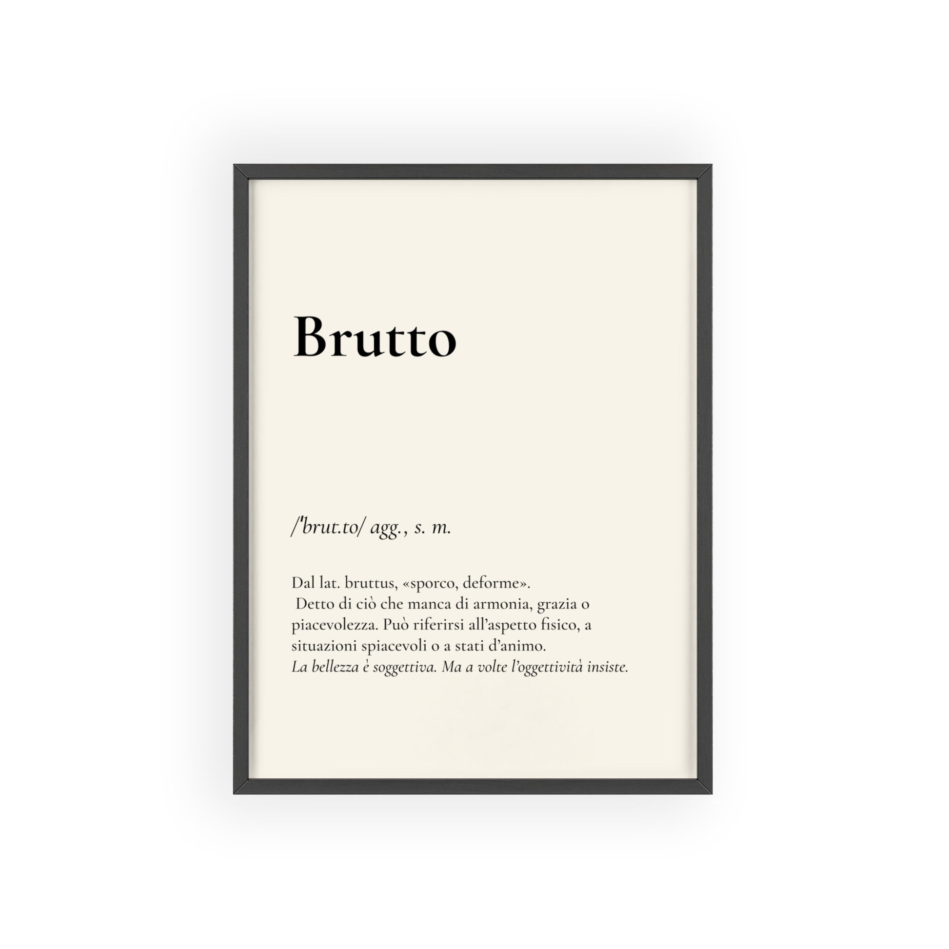 Con tono da vocabolario Treccani e verità da bar del lunedì mattina, questo poster definisce "Brutto" come solo l’esperienza può fare: prima con rigore linguistico, poi con una stilettata che ti fa sorridere (o riflettere su chi ti circonda).