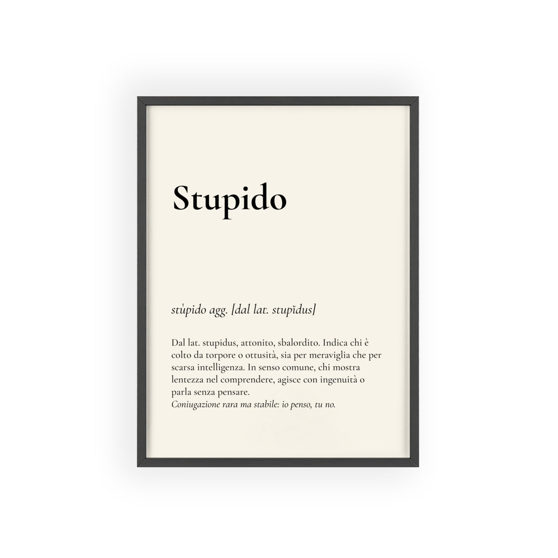 Con tono da vocabolario Treccani e verità da bar del lunedì mattina, questo poster definisce "stupido" come solo l’esperienza può fare: prima con rigore linguistico, poi con una stilettata che ti fa sorridere (o riflettere su chi ti circonda).